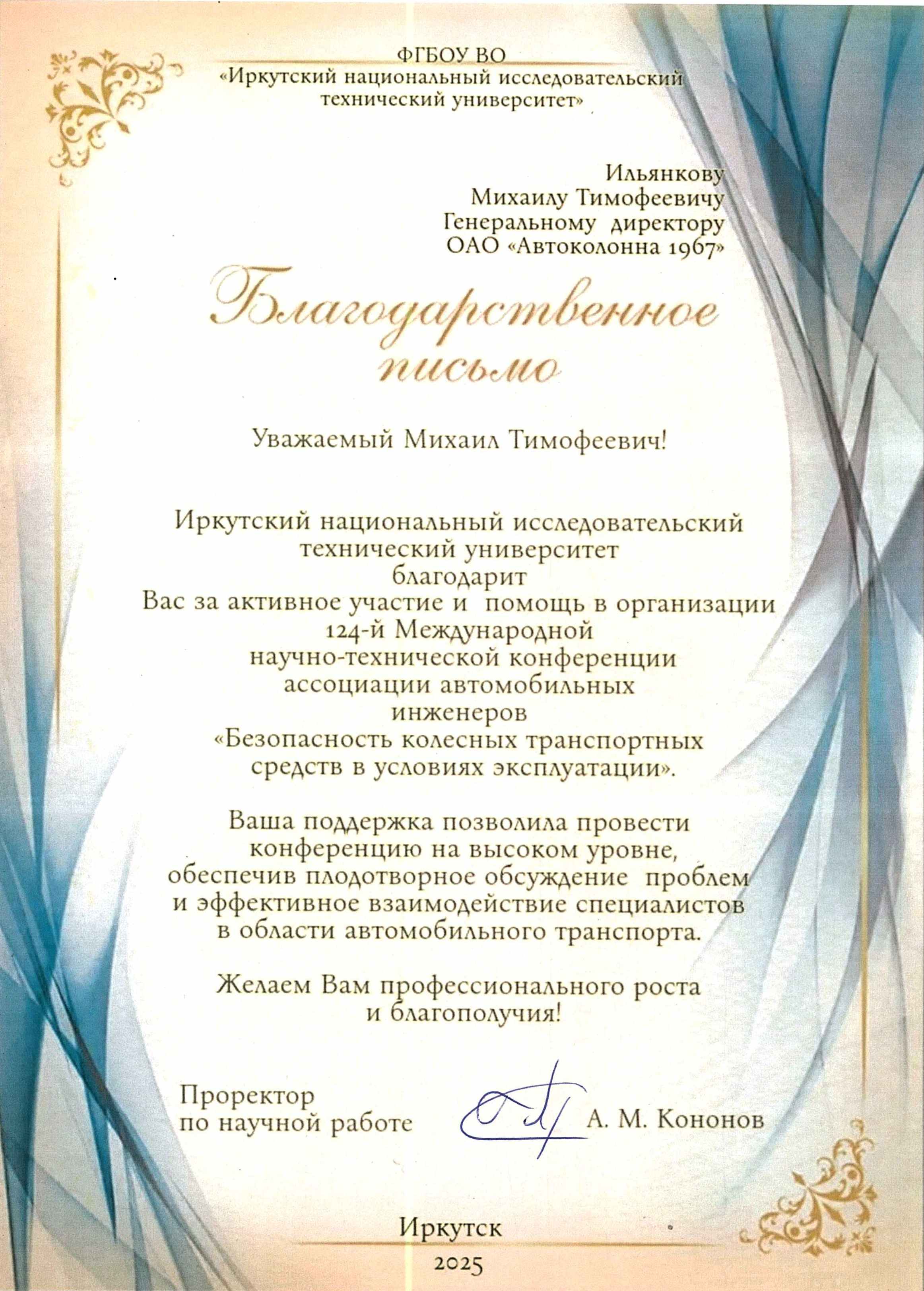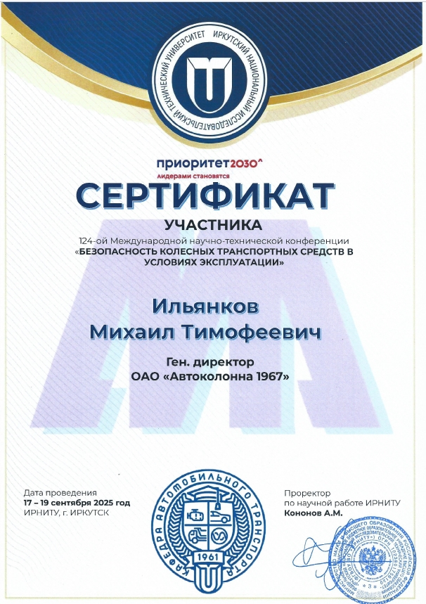 17 – 19 сентября 2025 года в г. Иркутске состоялась 124-я международная научно-техническая конференция Ассоциации автомобильных инженеров «БЕЗОПАСНОСТЬ КОЛЕСНЫХ ТРАНСПОРТНЫХ СРЕДСТВ В УСЛОВИЯХ ЭКСПЛУАТАЦИИ», в которой от ОАО «Автоколонна 1967» были представлены следующие доклады: