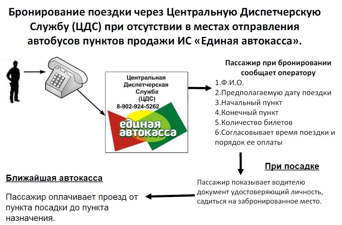 Теперь для поездки в автобусе пассажир можете забронировать место по телефону Центрально-диспетчерской службы (ЦДС) 8(902)924-52-62, но не боле чем за одни сутки до поездки и не менее 6 часов до отправления автобуса от пункта посадки.