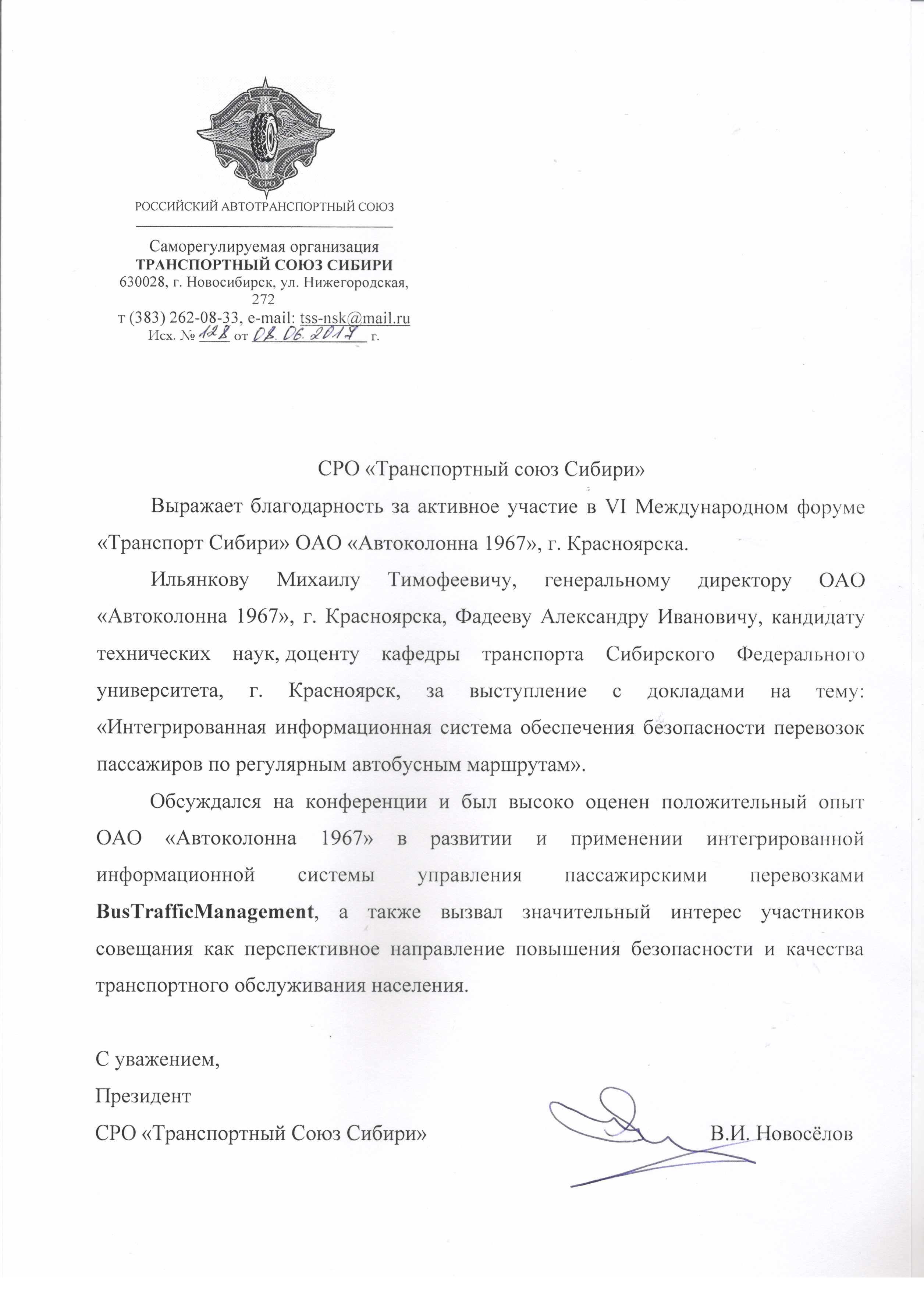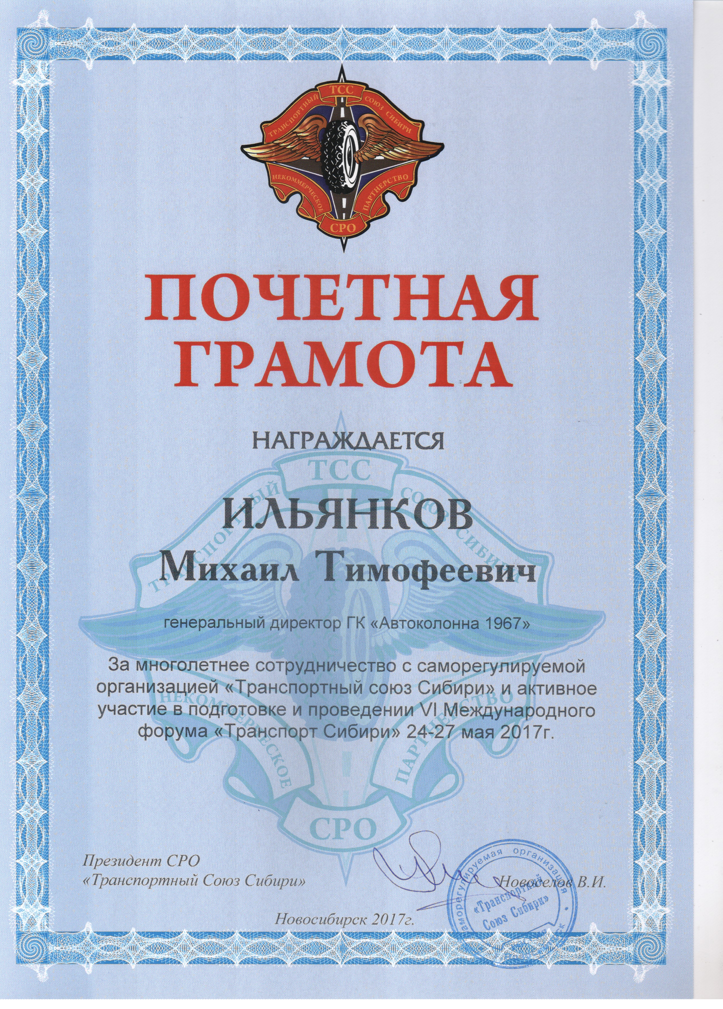 По итогам форума генеральный директор Ильянков Михаил Тимофеевич награжден почетной грамотой и благодарственным письмом за многолетнее сотрудничество с саморегулируемой организацией "Транспортный союз Сибири" и активное участие в подготовке и проведении VI Международного форума "Транспорт Сибири" 24-27 мая 2017 г.