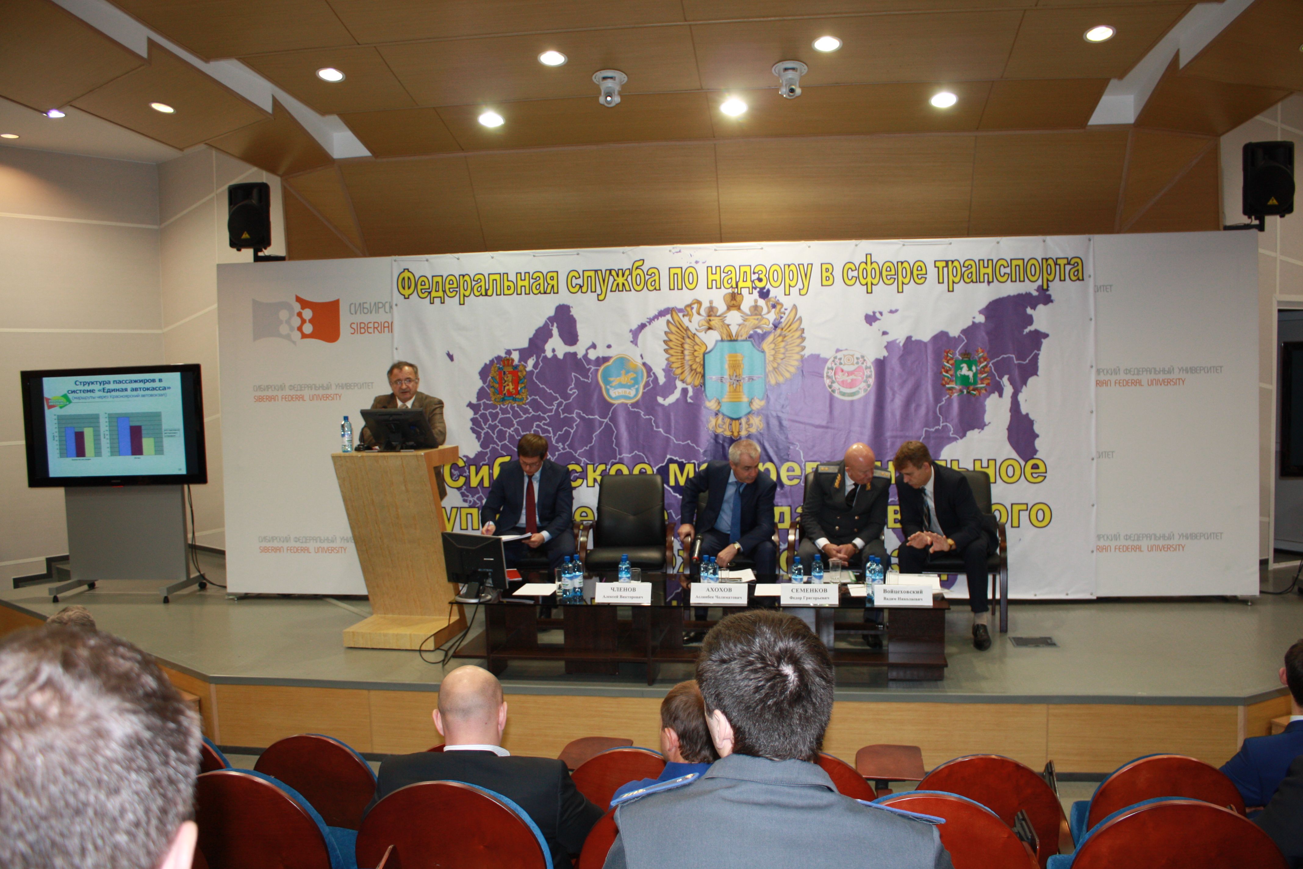 23 августа 2017 года в СФУ состоялись общественные слушания руководителей транспортных организаций по вопросам соблюдения требований безопасности при оказании услуг населению по перевозке пассажиров. В слушаниях приняли участие заместитель руководителя Федеральной службы по надзору в сфере транспорта Ахохов Асланбек Челиматович, временно исполняющий обязанности начальника Сибирского межрегионального управления государственного автодорожного надзора Семенков Федор Григорьевич, заместитель министра транспорта Красноярского края Войцеховский Вадим Николаевич, начальник управления государственной инспекции безопасности дорожного движения по Красноярскому краю Членов Алексей Викторович.