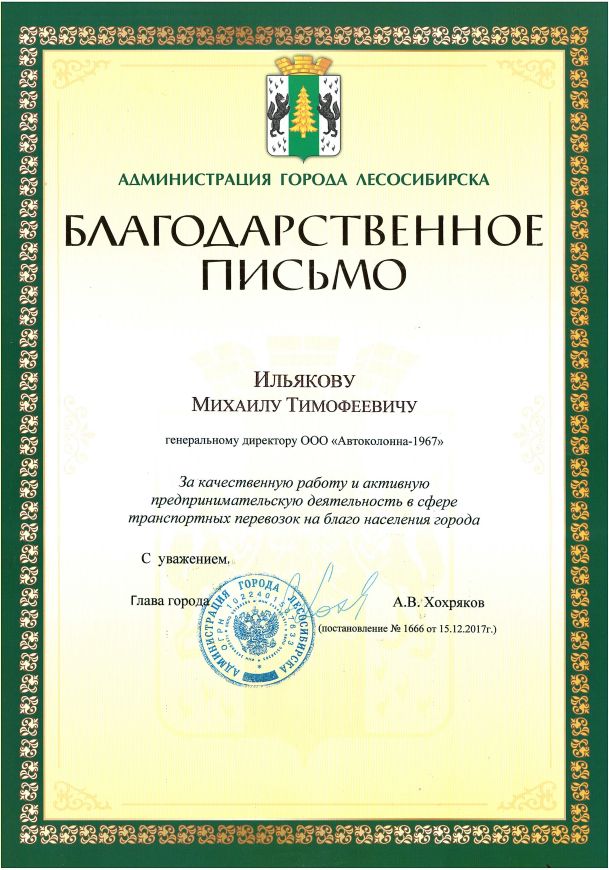За качественную работу и активную предпринимательскую деятельность в сфере транспортных перевозок на благо населения подписано постановление № 1666 от 15 декабря 2017 года главы г. Лесосибирска А.В. Хохрякова о награждении Благодарственным письмом ОАО «Автоколонна 1967»