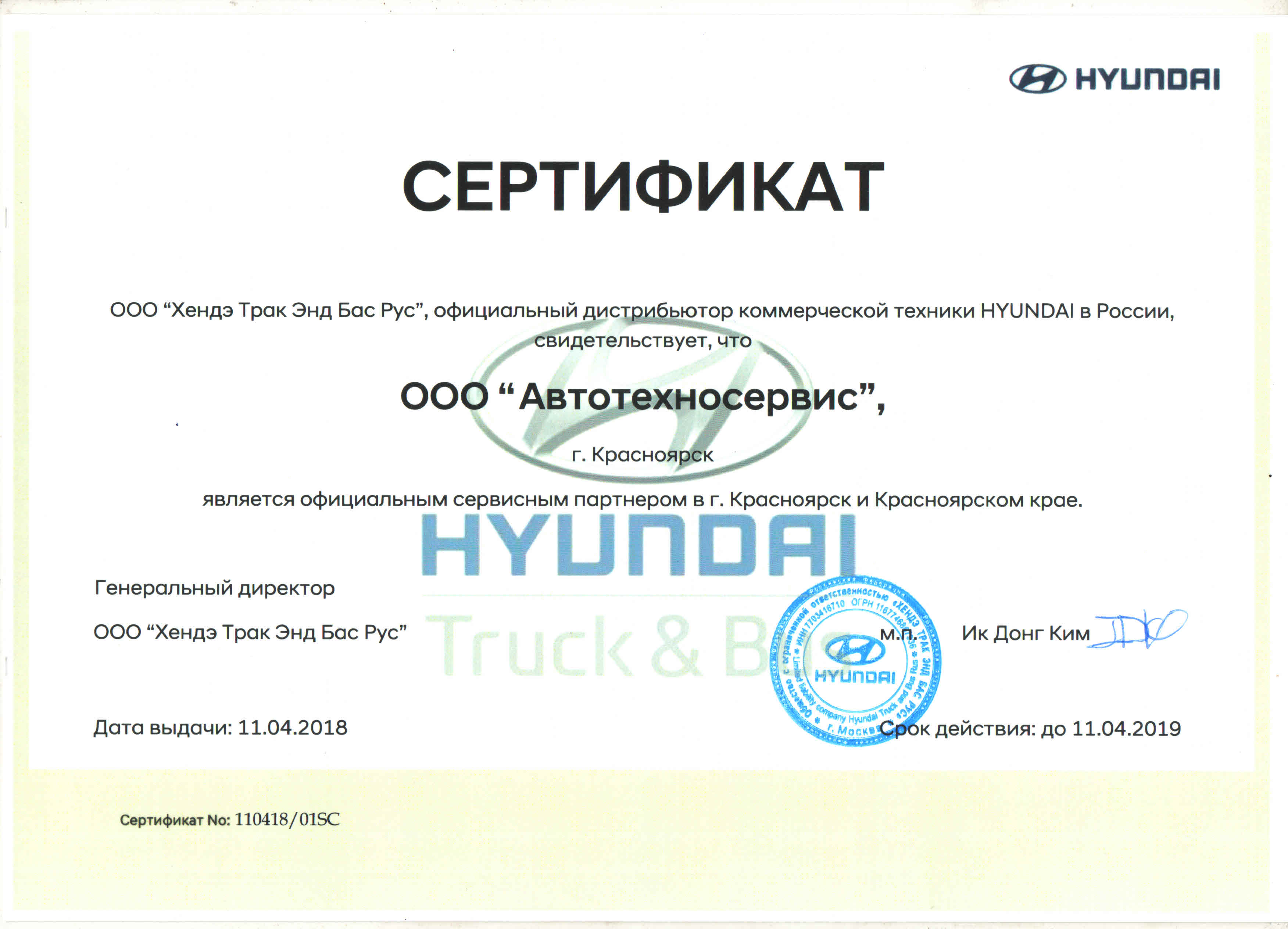 11.04.2018 г. ООО «Автотехносервис» (дочерняя организация ОАО «Автоколонна 1967» присвоен статус официального сервисного партнера в г. Красноярске и красноярском крае компании Hyundai (Ю. Корея). Сертификат выдан от имени компании ООО «Хенде Трак Анд Бас Рус», официального дистрибьютера коммерческой техники Hyundai в России.