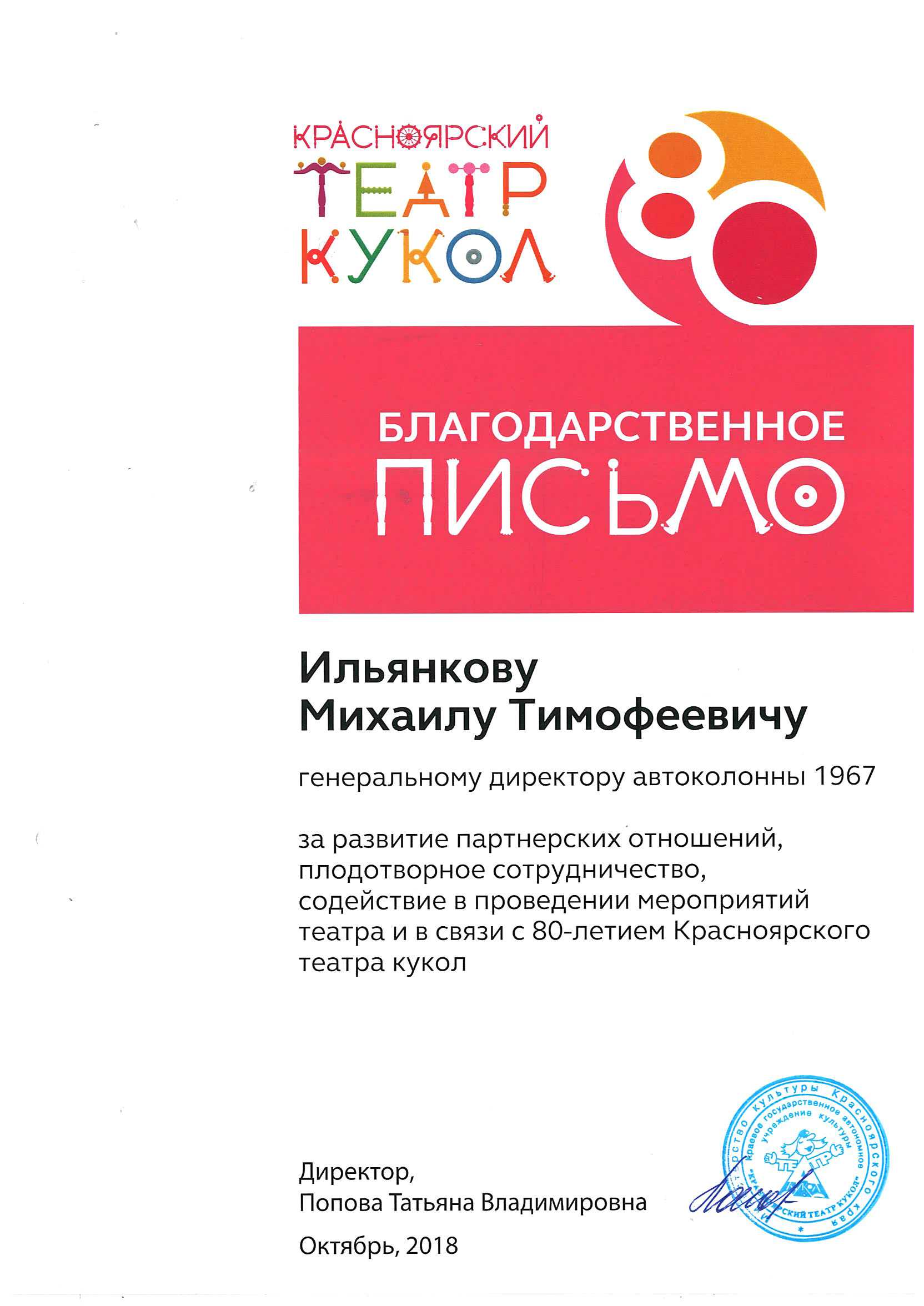 Михаилу Тимофеевичу Ильянкову, генеральному директору автотранспортной компании ОАО «Автоколонна 1967», юбиляры вручили Благодарственное письмо «За развитие партнёрских отношений, плодотворное сотрудничество, содействие в проведении мероприятий театра и в связи с 80-летием Красноярского театра кукол». В сентябре этого года «Автоколонна 1967» оказала помощь Красноярскому театру кукол в организации трансфера для коллектива Государственного академического Центрального театра им. С.В. Образцова (г.Москва) в рамках федеральной программы «Большие гастроли».