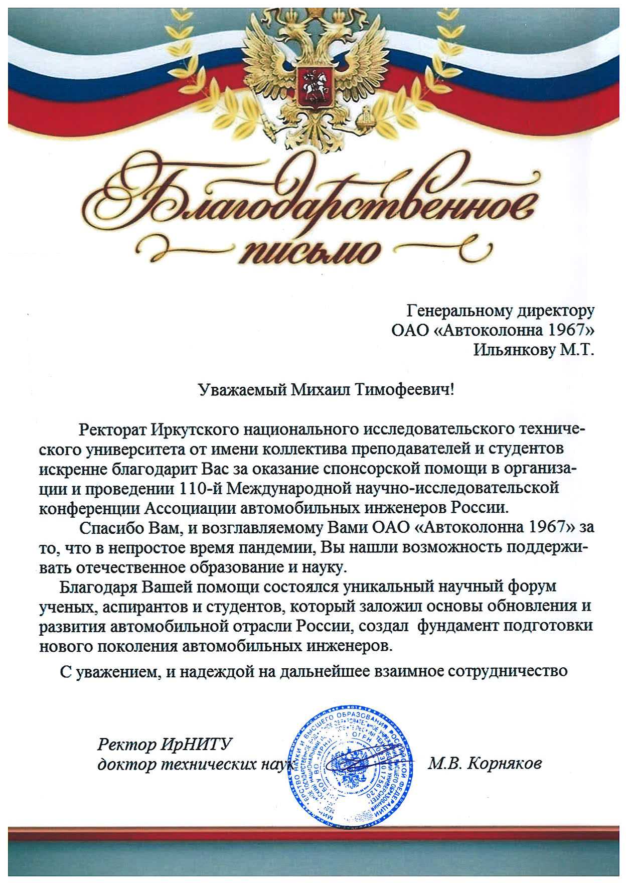 4 июня 2021 года на 110-й Международной научно-технической конференции «БЕЗОПАСНОСТЬ КОЛЕСНЫХ ТРАНСПОРТНЫХ СРЕДСТВ В УСЛОВИЯХ ЭКСПЛУАТАЦИИ» в Иркутском национально исследовательском техническом университете (г. Иркутск) представлены доклады: