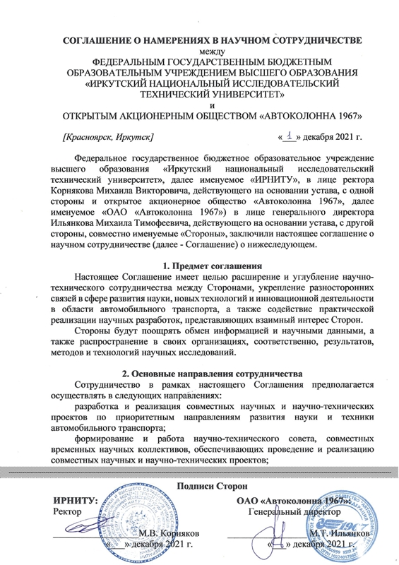 25-27 ноября 2021 года в ОАО «Автоколонна 1967» проведен семинар с участием делегации кафедры «Автомобильный транспорт» Иркутского национального исследовательского технического университета (ИРНИТУ) под руководством доктора технических наук, профессора А.И. Федотова, на котором обсуждались задачи совместной деятельности в области повышения эффективности технического содержания автотранспортных средств в условиях крупной транспортной компании. По результатам семинара между ОАО «Автоколонна 1967» и ИРНИТУ подписано Соглашение о намерениях в научном сотрудничестве